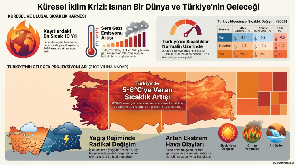 Küresel iklim verileri, Türkiye’nin hızla ısındığını ve yüzyıl sonuna kadar sıcaklıkların 5-6 derece artabileceğini gösteriyor. Uzmanlara göre bu değişim, kuraklık, sel ve aşırı hava olaylarını daha sık ve yıkıcı hale getirebilir.